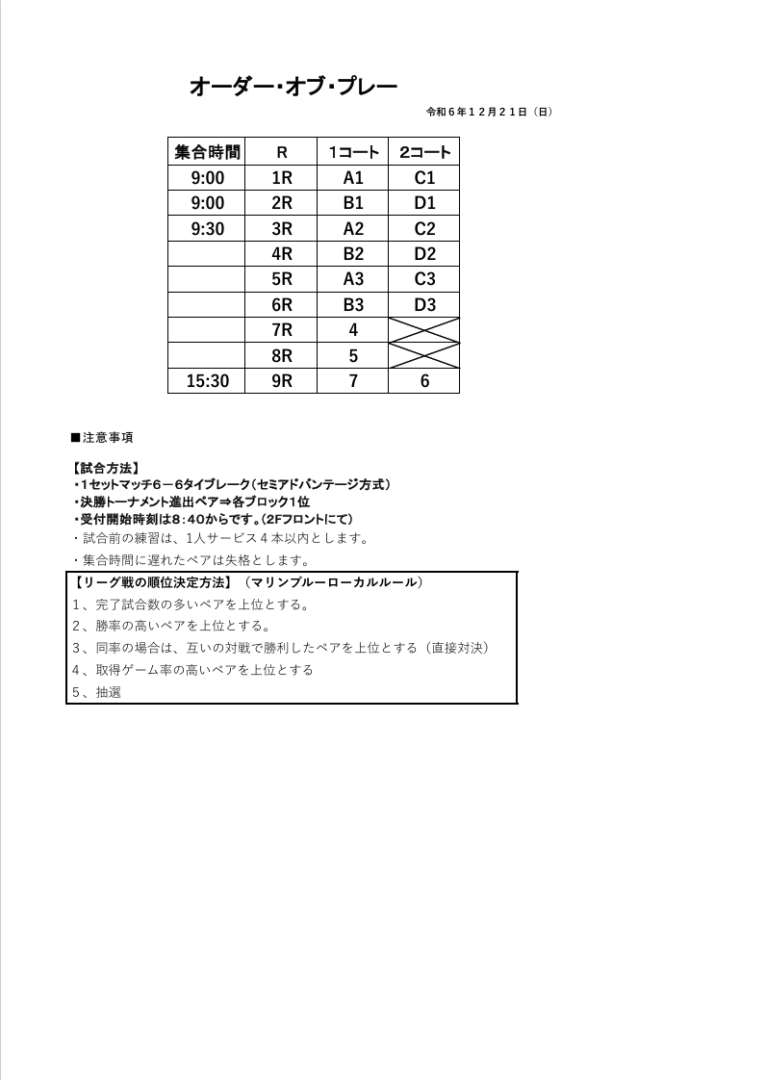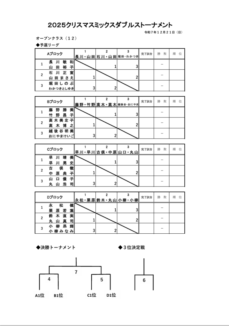 12/21(日)に開催されます、2025クリスマスミックスダブルストーナメントの仮ドローを掲載いたします。
