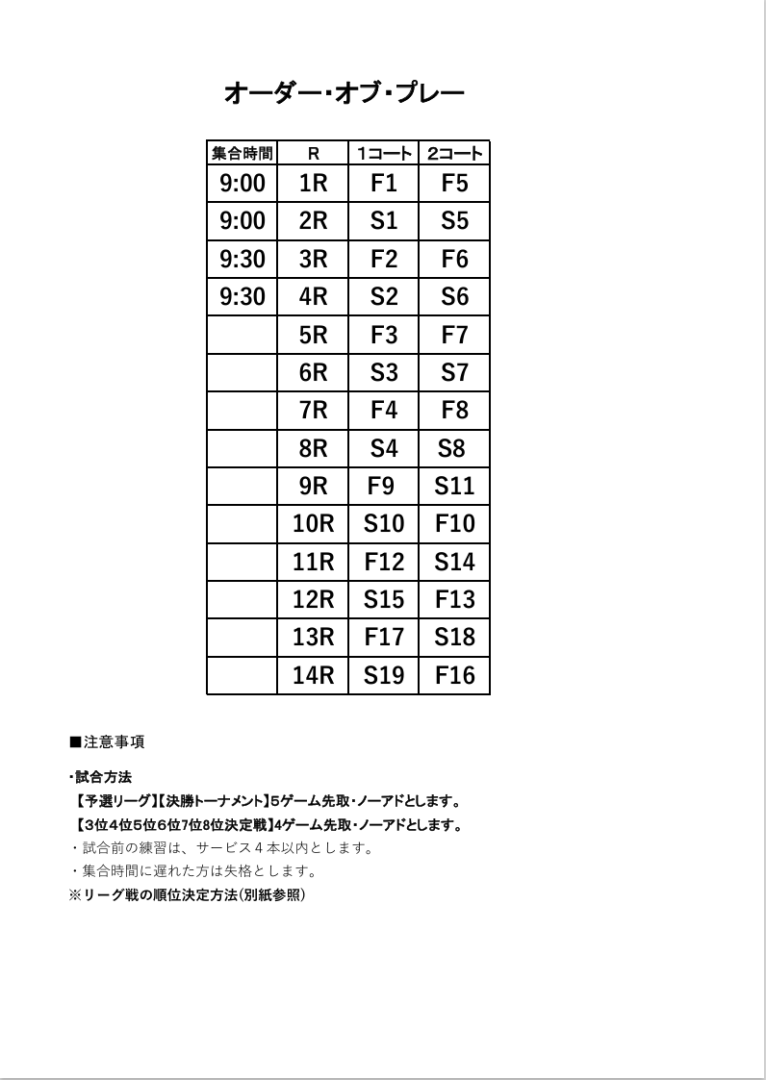 マリンブルー2F受付前の掲示板にも発表していますので参加選手の皆様はご確認ください。