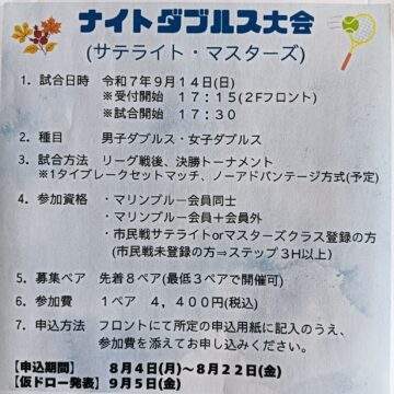 こんにちは!品田です☺ 9/14(日)に開催されます、ナイトダブルス大会の仮ドローを発表します。 マリンブルー2F出入り口横の掲示板にも仮ドローを発表していますので参加選手の皆様はご確認ください。 よろしくお願い致します […]